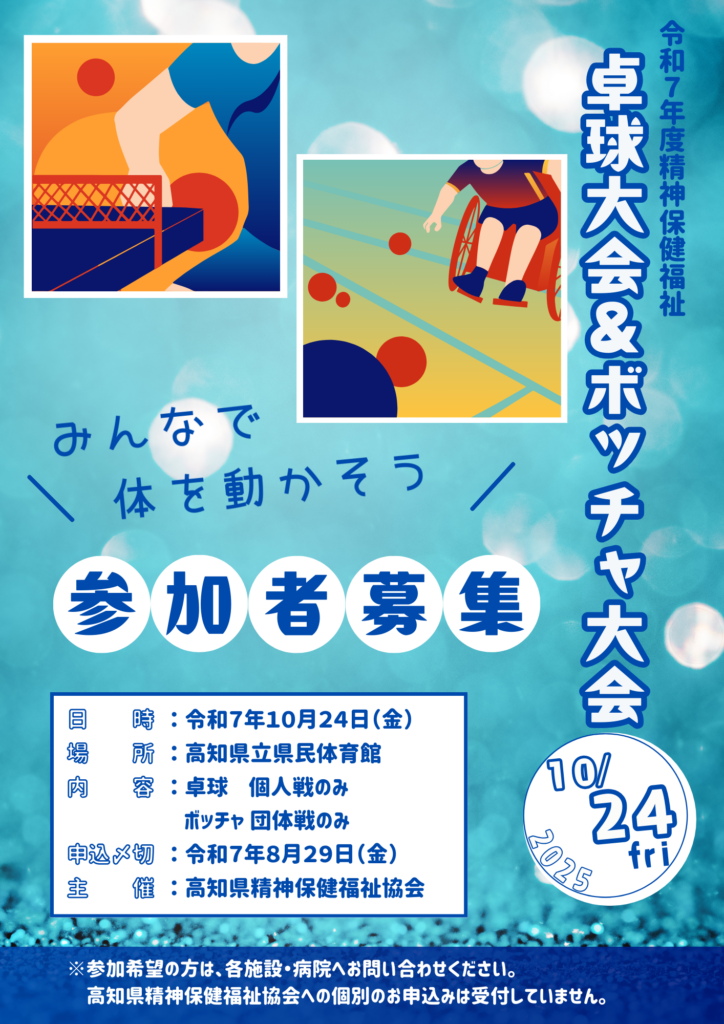 来年は、卓球大会が記念すべき60回目を迎えます。 これからも、皆さまと一緒にスポーツを楽しみ、心を通わせる時間を大切にしていければと思います。また来年、皆さまの笑顔にお会いできるのを楽しみに待っています!(詳しくは、会報「高知精神保健」291号をご覧ください。)